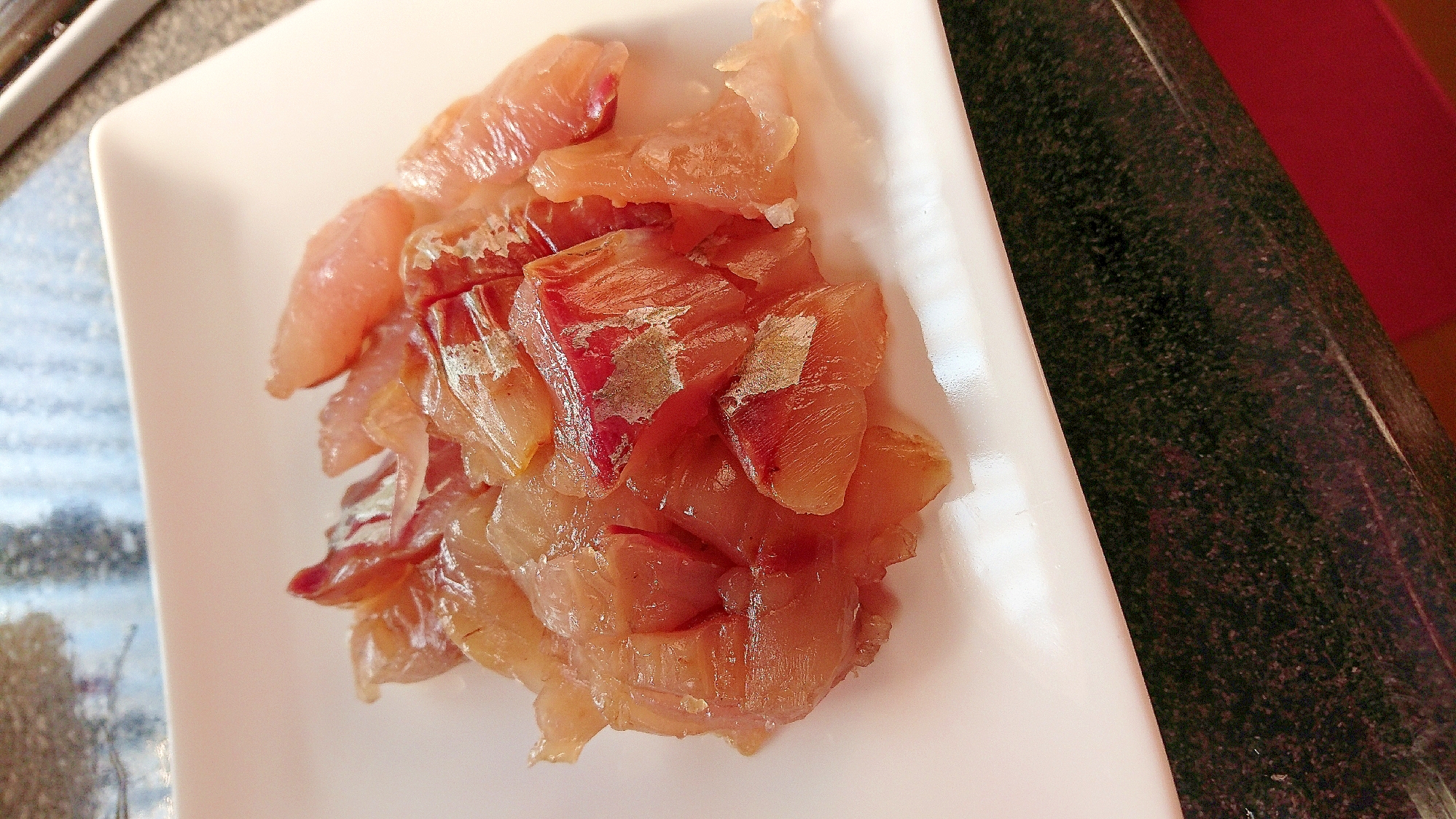 バンビ フクラギのマリネの作り方 刺身と同じように切り身にしたフクラギを塩水にさらす 今回は飽和水溶液に30秒ほど ザルにあけて水気を切り レモン汁かワインビネガーをまぶす Exvオリーブ油にニンニク イタリアンパセリ 鷹の爪 サラダ油を少し